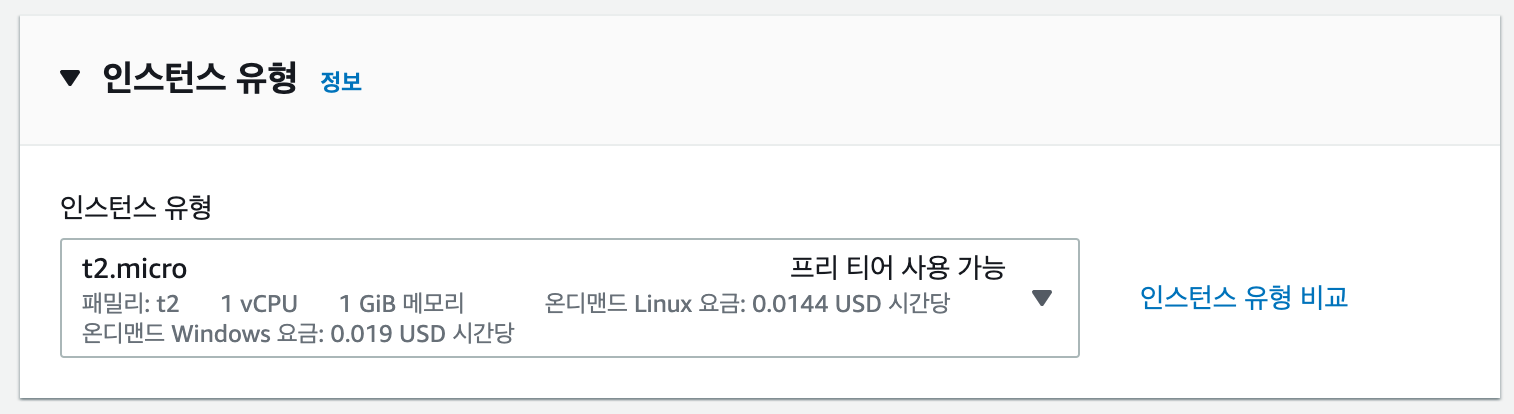 아래로 내려보면 인스턴스 유형을 고르는 부분이 있어요. 이 부분은 건들지 않고 내려가겠습니다. 프리 티어가 사용할 수 있는 인스턴스 유형이 정해져 있어서 다른 것을 고르면 추가로 돈을 내야할 수도 있어요.
