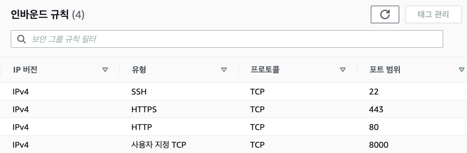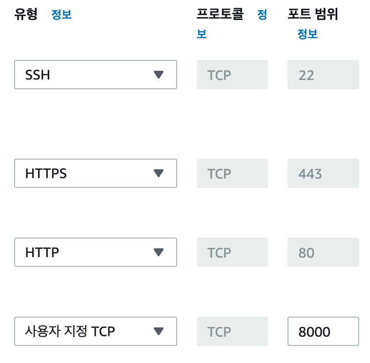 그 중에서 SSH, HTTPs, HTTP는 아까 추가했으니 8000번 포트만 추가로 열어두시면 됩니다. 아래처럼 사용자 지정 TCP 8000 번을 추가해주세요.