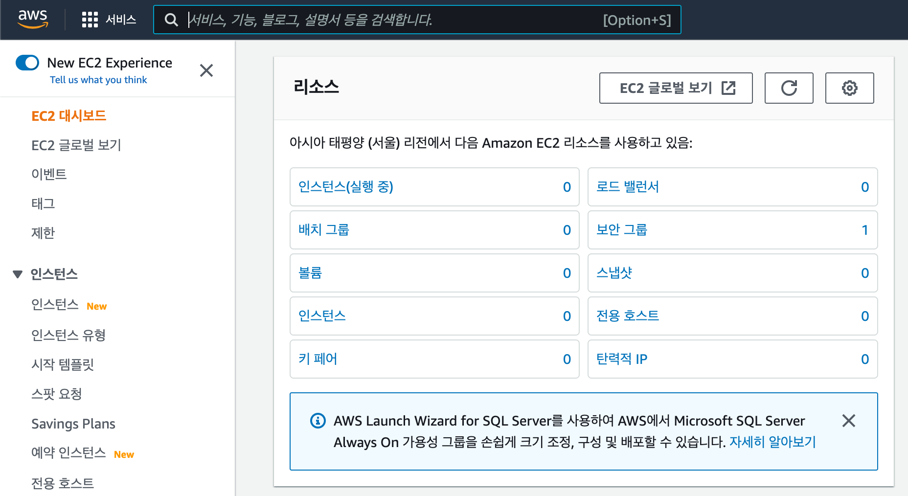 다시 EC2 콘솔로 돌아가면 아마 인스턴스 (실행중) 에 1이 생겼을 겁니다.