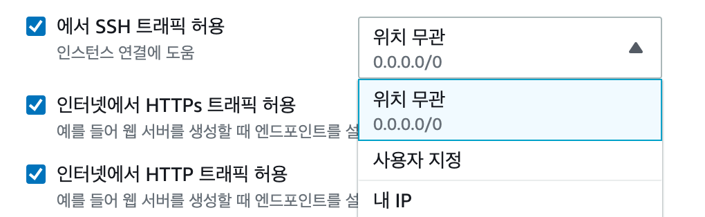 그 다음으로는 우리 인스턴스에 어떤 서비스를 접근시킬 것인지 고르게 됩니다. 우리는 SSH를 통해서 인스턴스에 접근할 것이고, 웹 상에 프로젝트를 배포할 것이기에 SSH, HTTPs, HTTP 트래픽을 모두 허용하겠습니다. SSH의 경우에는 보안을 위해서 내 IP에서만 접근할 수 있도록 할게요. SSH, HTTPs, HTTP 트래픽을 허용한다는게 무엇인지는 아래에서 설명하겠습니다.