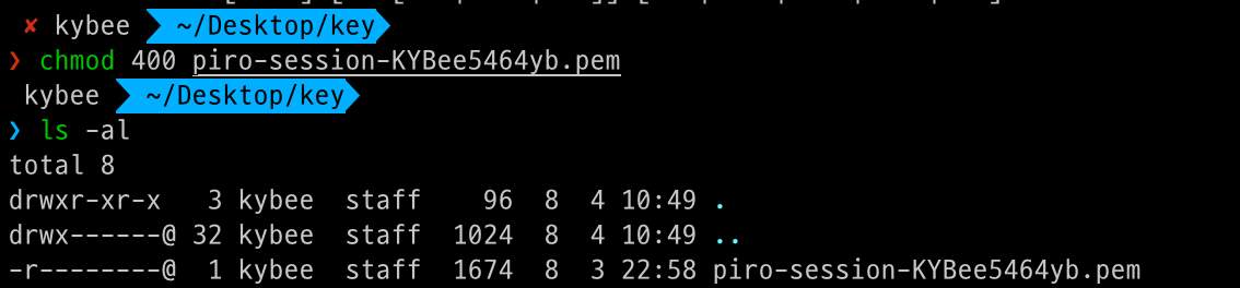 해당 키 페어를 읽기 전용 모드로 바꾸어서 수정이 불가능하게 만든 겁니다. ls -al 명령어를 입력했을 때 왼쪽에 -r—-—-— 이 보이면 됩니다. chmod 는 change mode의 줄임말이에요!