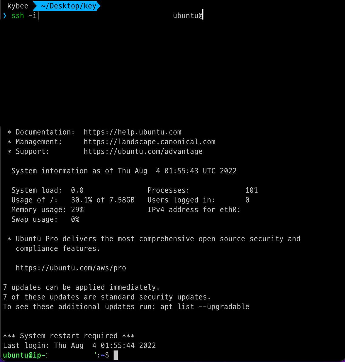 $ ssh ubuntu@{여러분의 IP} -i {key pair 이름}.pem