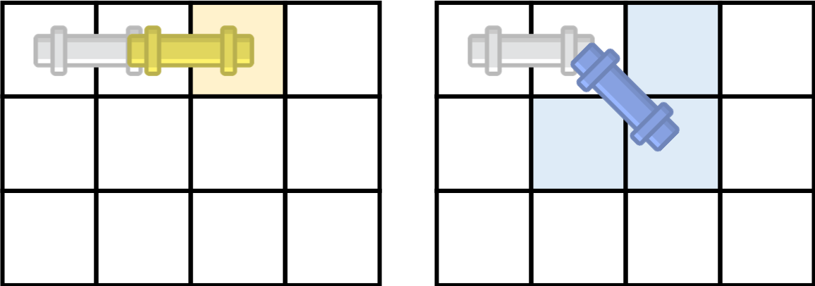 오늘은 집 수리를 위해서 파이프 하나를 옮기려고 한다. 파이프는 아래와 같은 형태이고, 2개의 연속된 칸을 차지하는 크기이다.