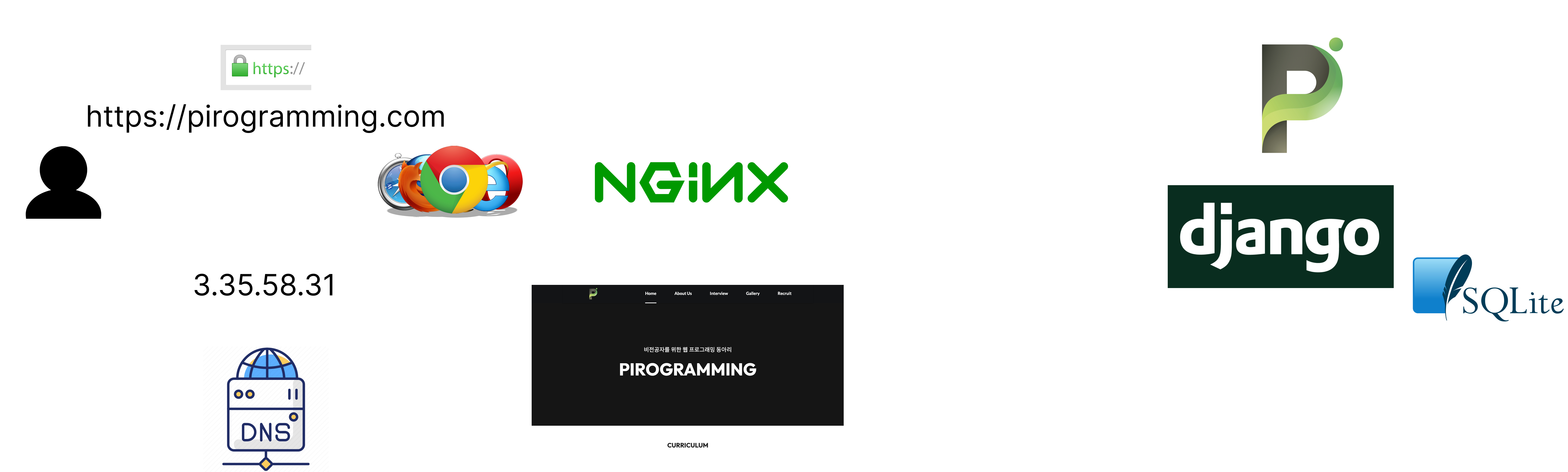 피로그래밍 홈페이지 프로그램이 돌아가는 서버에는 NGINX가 설치되어 있네요. 현재 홈 페이지 화면은 정적 화면입니다. html, css, 그리고 약간의 js와 img로만 구성되어 있습니다. 그렇기에 NGINX에서 요청을 실제 장고 서버까지 보내지 않고 처리하게 됩니다.