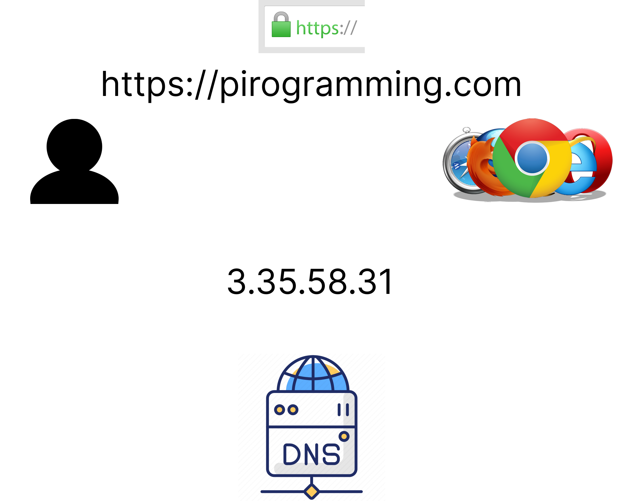 현재 브라우저가 피로그래밍의 아이피 주소를 모른다고 가정할게요. 그러면 브라우저는 DNS에 피로그래밍.com의 IP 주소를 알려달라고 요청합니다. DNS의 동작에 따라서 브라우저는 아이피 주소와 포트 쌍을 얻게 됩니다.