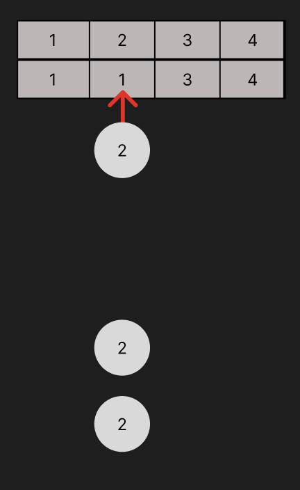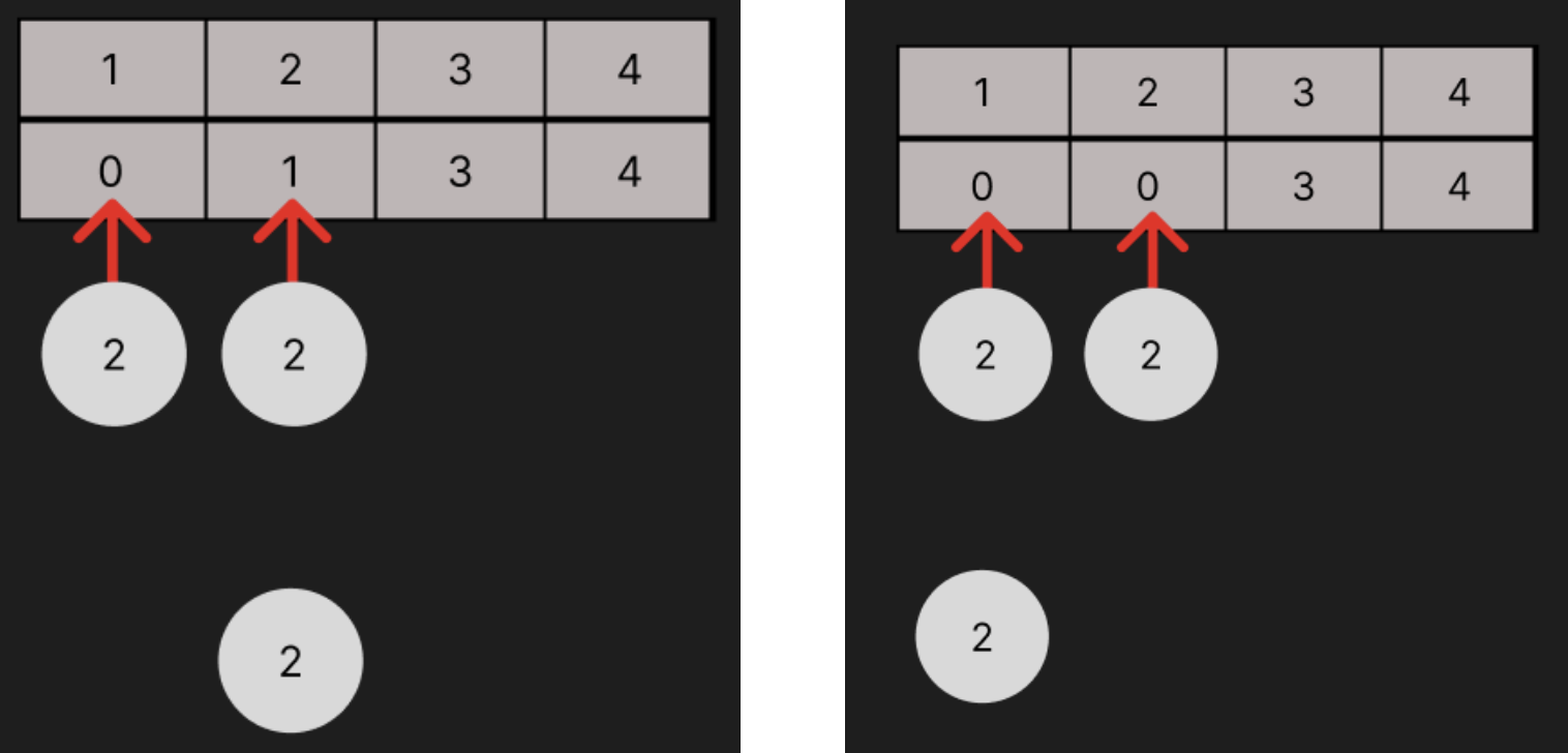 그 다음 비행기가 2번으로 도킹을 시도한다. 현재 게이트 2의 값이 1이기 때문에 2번 게이트는 도킹을 시도할 수 없고 1번으로 도킹을 시도한다. 1번 게이트는 비어있기 때문에 1번 게이트에 도킹한다. 1번 게이트의 값이 1보다 하나 작은 0으로 바뀐다.