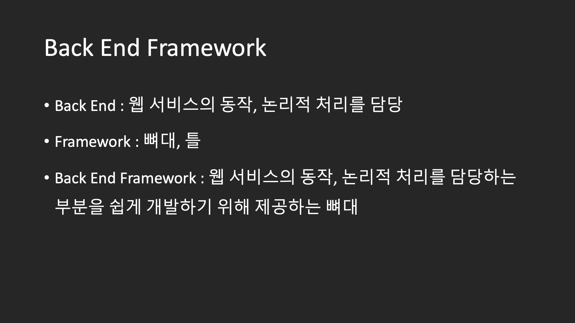 백엔드 프레임워크라는 말을 그대로 해석해볼게요. 우선 백엔드는 위에서 설명했던 웹 서비스의 동작과 논리적 처리를 담당하는 부분이구요. 프레임워크는 직역하면 뼈대, 틀이라는 뜻 입니다.