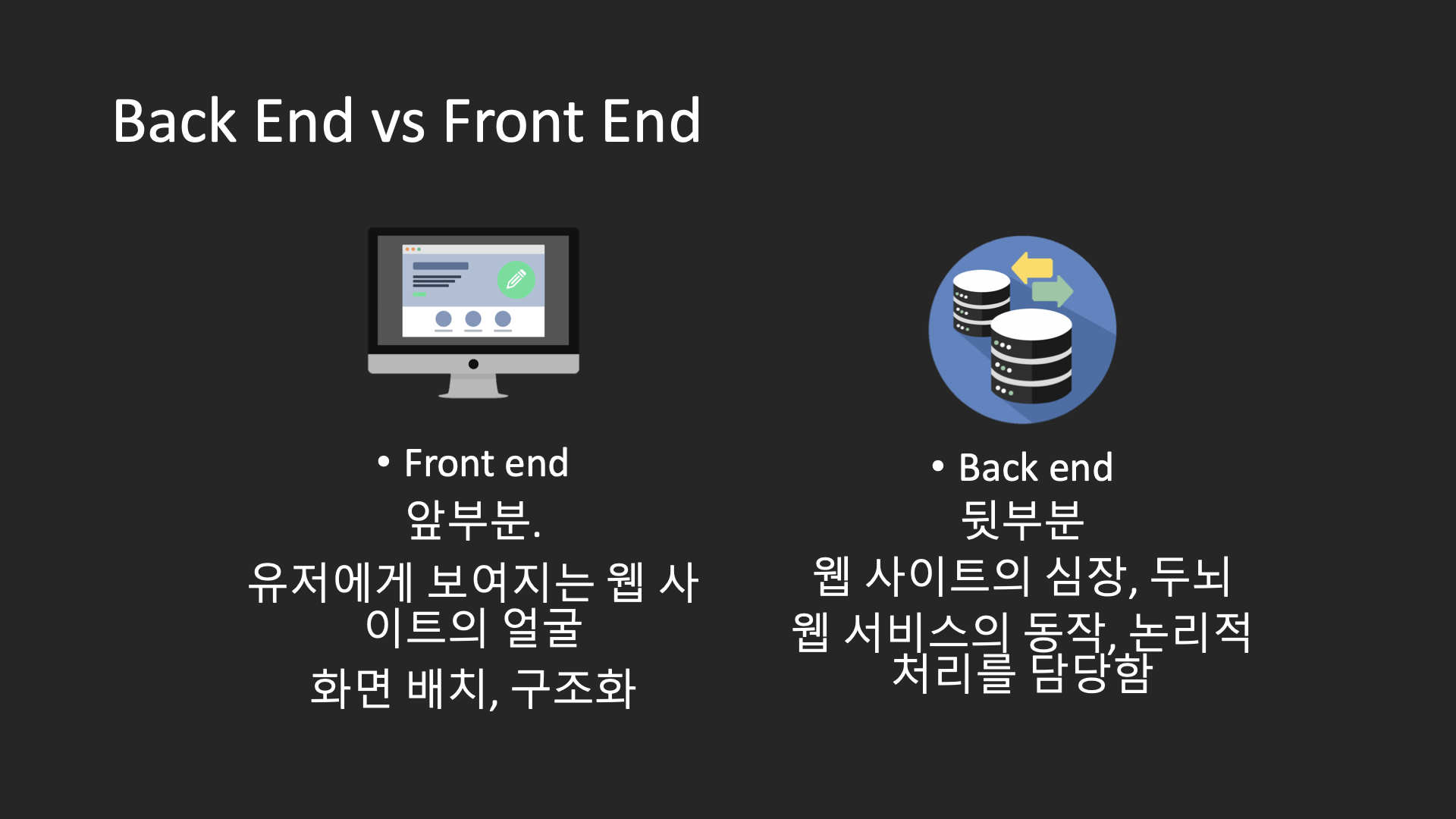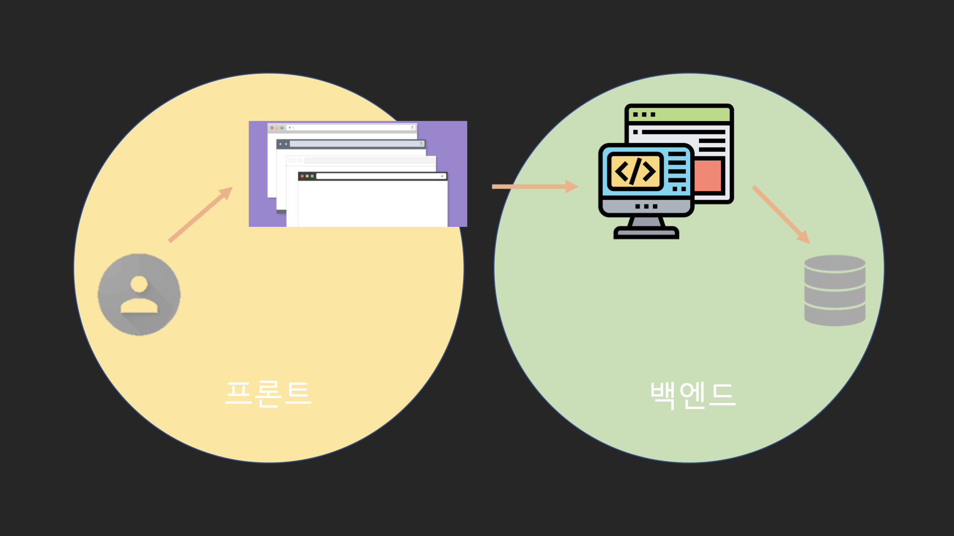 이걸 그림으로 표현한게 앞의 그림이에요, 유저와 가까운게 프론트, 데이터베이스와 가까운게 백엔드라고 지금은 생각하셔도 됩니다.