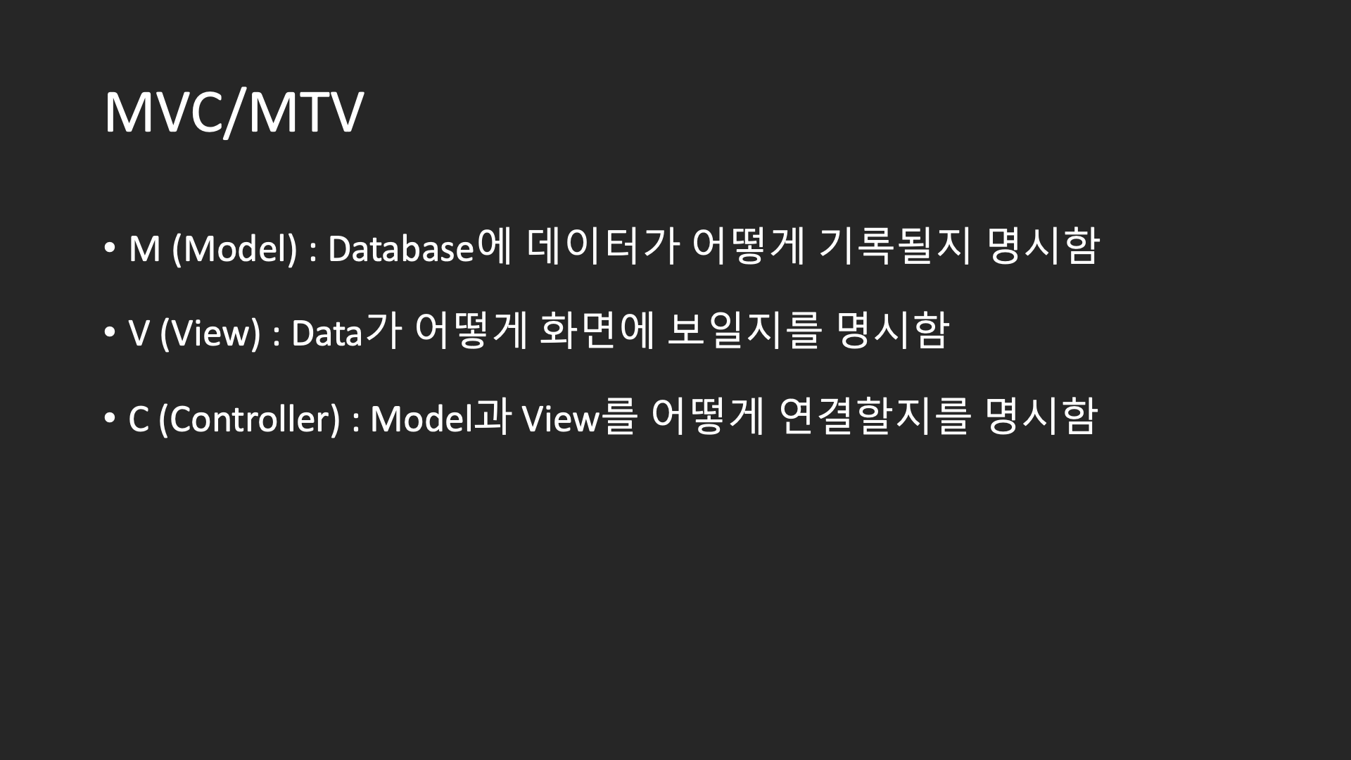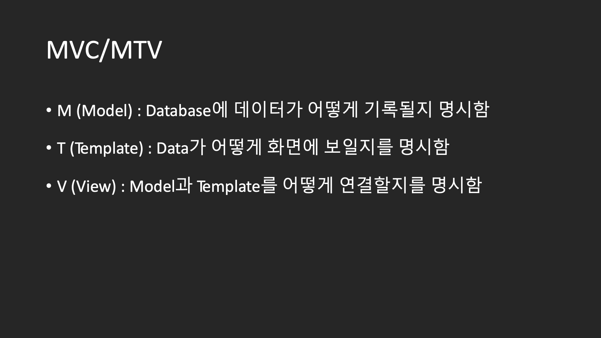 자 그런데 Django는 MVC 패턴을 따르지만 Model View Controller라는 명칭을 사용하진 않습니다. Django에서는 Model은 Model이라고 부르지만 View는 Templates라고 부르구요 Controller를 View라고 부릅니다. 그래서 Django는 MVC에서 정의한 형태대로 구현되어있지만 MTV 패턴이라고 부릅니다.