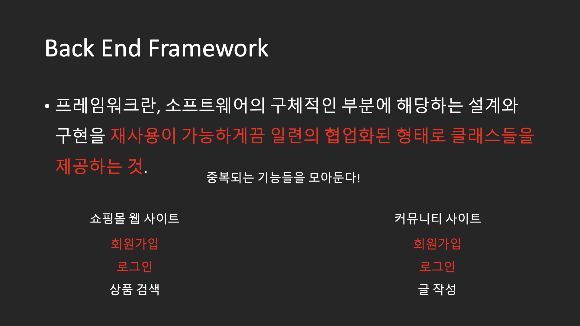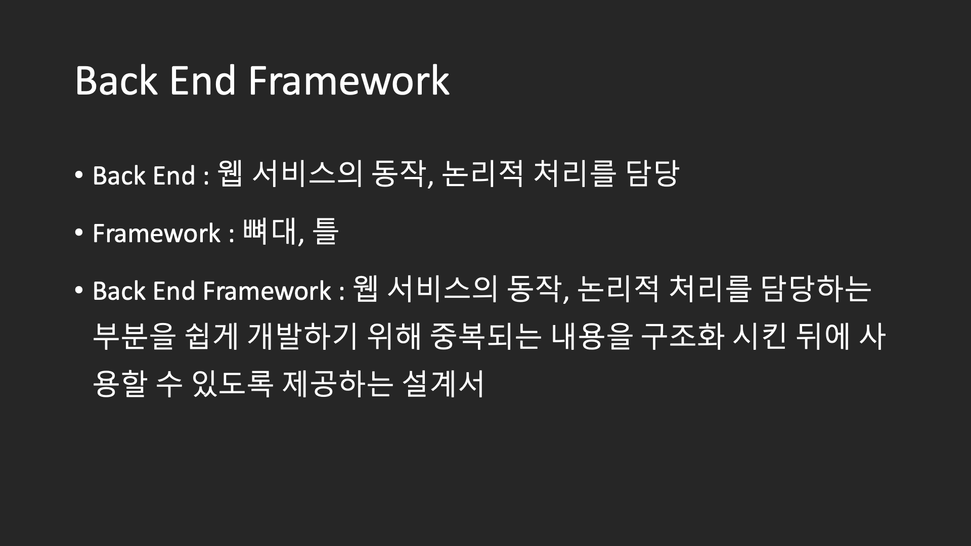 그래서 결과적으로 백엔드 프레임워크가 무엇인지를 정의해보면 웹 서비스의 동작과 논리적인 처리를 담당하는 부분을 개발하는 과정에서, 중복되는 내용을 구조화 시켜서 제공해주는 하나의 설계서라고 생각하시면 될 것 같습니다.