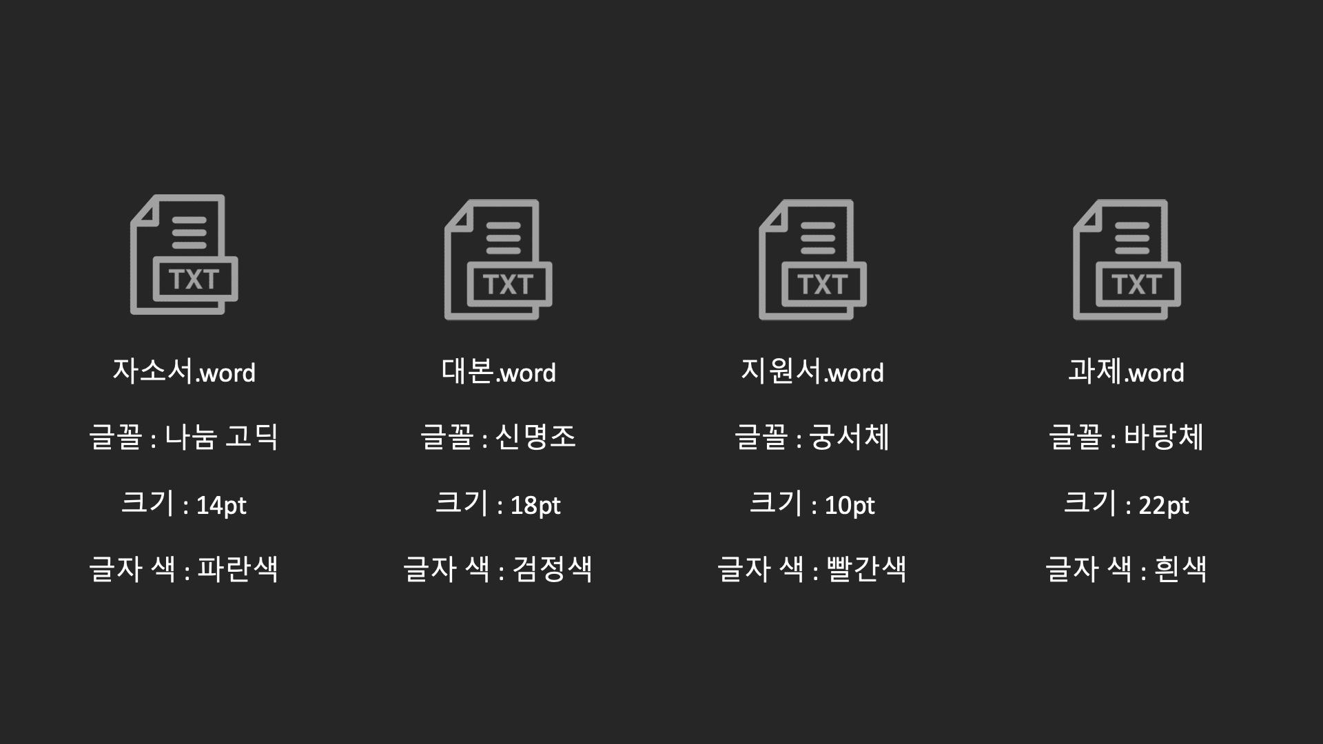 우리가 워드를 사용해서 4개의 문서를 작성한다고 가정할게요. 앞에 보이는 문서들을 다 만들었습니다. 우리는 워드라는 하나의 소프트웨어를 사용했죠? 혹시 저 문서들은 모두 똑 같은 워드를 사용했기 때문에 모두 글꼴, 글꼴 크기, 글자색을 똑같이 사용해야 할까요?