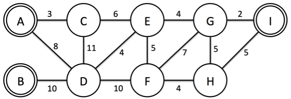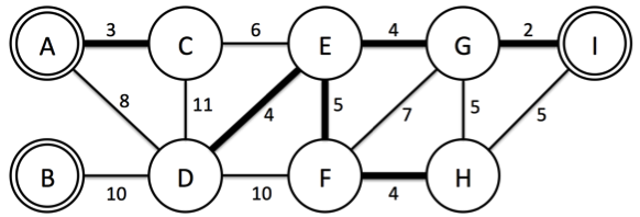 살기 좋은 나라 1등으로 꼽힌 이후 외국인 방문객들이 많아졌고, 그에 따라 전기 소비율이 증가하여 전기가 많이 부족한 상황이 되었다. 따라서 서강 나라의 대통령은 최근 개발이 완료된 YNY발전소 프로젝트를 진행 하기로 하였다. 발전소를 만들 때 중요한 것은 발전소 건물과 도시로 전기를 공급해 줄 케이블이다. 발전소는 이미 특정 도시에 건설되어 있고, 따라서 추가적으로 드는 비용은 케이블을 설치할 때 드는 비용이 전부이다. 이 프로젝트의 문제는 케이블을 설치할 때 드는 비용이 굉장히 크므로 이를 최소화해서 설치하여 모든 도시에 전기를 공급하는 것이다. 여러분은 N개의 도시가 있고 M개의 두 도시를 연결하는 케이블의 정보와 K개의 YNY발전소가 설치된 도시가 주어지면 케이블 설치 비용을 최소로 사용하여 모든 도시에 전기가 공급할 수 있도록 해결해야 한다. 중요한 점은 어느 한 도시가 두 개의 발전소에서 전기를 공급받으면 낭비가 되므로 케이블이 연결되어있는 도시에는 발전소가 반드시 하나만 존재해야 한다. 아래 Figure 1를 보자. 9개의 도시와 3 개의 YNY발전소(A,B,I)가 있고, 각각의 도시들을 연결할 때 드는 비용이 주어진다.