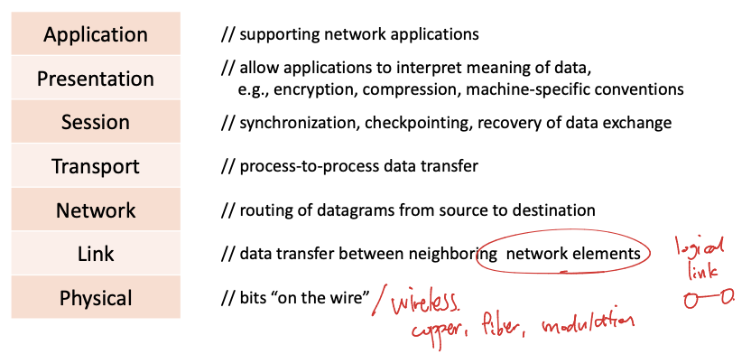 - 데이터 링크 계층 (Data Link Layer) : 하나의 링크로 연결된 노드 사이의 Frame(비트 묶음)을 교환한다.