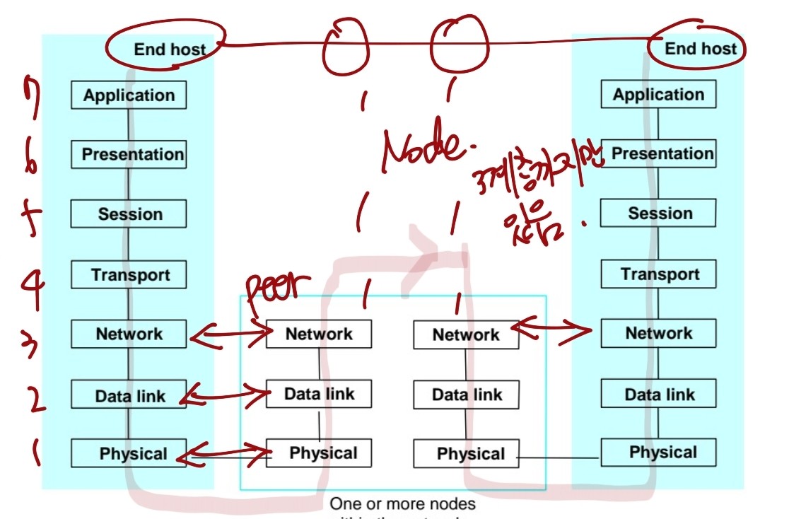 - Frame을 전달받은 중간 노드는 이를 디 캡슐화 해서 네트워크 Packet을 확보한 뒤에 경로를 설정하여 어떤 노드에게 Packet을 줘야할 지 정한 뒤에 다시 네트워크 헤더를 붙여 Frame으로 만들고 데이터 링크 계층에게 보낸다.