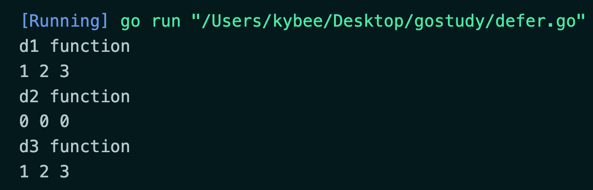 3부터 1까지 실행하면서 i를 출력한다. 이때 출력하는 코드 앞에 defer을 적었기 때문에, 해당 코드는 d1함수가 종료될 때 실행된다. defer 키워드를 만나 가장 최근에 실행을 미루었던 코드부터 실행된다.